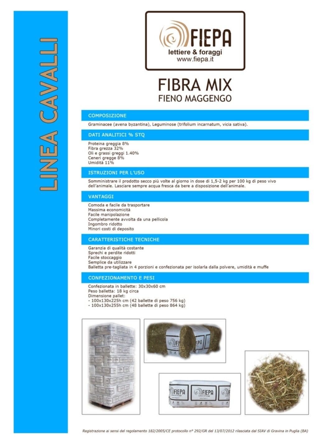 COMPOSIZIONE Graminacee (avena byzantina), Leguminose (trifolium incarnatum, vicia sativa). DATI ANALITICI % STQ Proteina greggia 8% Fibra grezza 32% Cens e grassi greggi 1.40% Umidita e 8% 1% ISTRUZIONI PER L'USO Somministrare il prodotto secco pi volte al giorno in dose di 1,5-2 kg per 100 kg di peso vivo dell'animale. Lasciare sempre acqua fresca da bere a disposizione dell'animale. VANTAGGI Comoda e facile da trasportare Massima economicit Facile manipolazione Completamente avvolta da una pellicola Ingombro ridotto Minori costi di deposito CARATTERISTICHE TECNICHE Garanzia di qualit costante Facile stocc ridotti Semplice da utilizzare Balletta pre-tagliata in 4 porzioni e confezionata per isolarla dalla polvere, umidite muffe CONFEZIONAMENTO E PESI Confezionata in ballette: 30x30x60 cm Peso balletta: 18 kg circa Dimensione pallet: - 100x130x225h cm (42 ballette di peso 756 kg) - 100x130x255h cm (48 ballette di peso 864 kg)